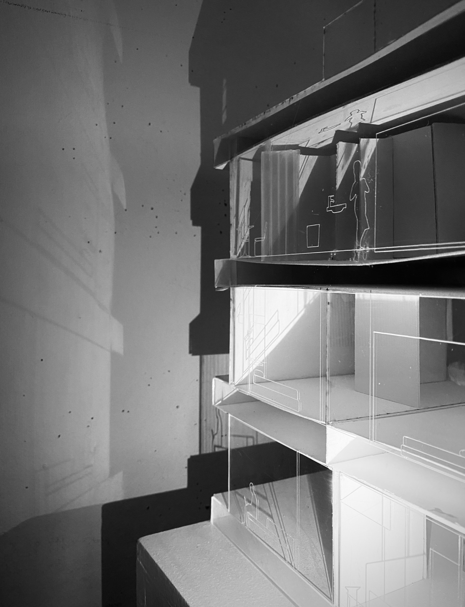 The site restricts the overall building composition. However, the L-shaped units allow for a staggering pattern to occur. The units can mirror in both horizontal and vertical directions, interrupting the seamlessness of the parcel rectangle.